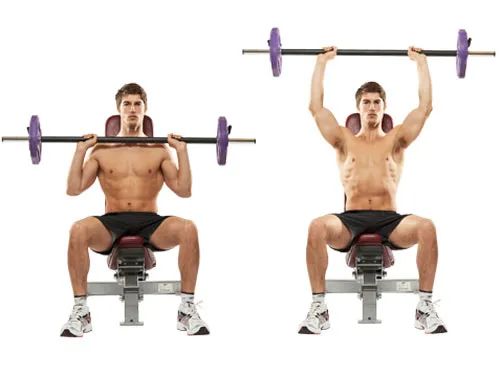 坐姿杠铃肩上推举 | 将第一组动作作为热身动作。4 组,每组 12、10、10、8 次(休息 90 秒) |