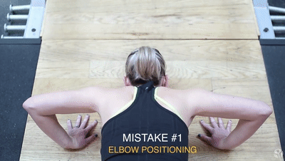 如果你的手肘和肩膀平齐,首先这样不容易发力,其次这很容易造成肩峰撞击,导致肩膀出现疼痛和伤病。所以你要让手肘和身体保持45度角。推荐的一个技巧就是手掌五指张开,牢牢地抓住地面,然后双手向外旋转,找到手肘夹紧身体的感觉。